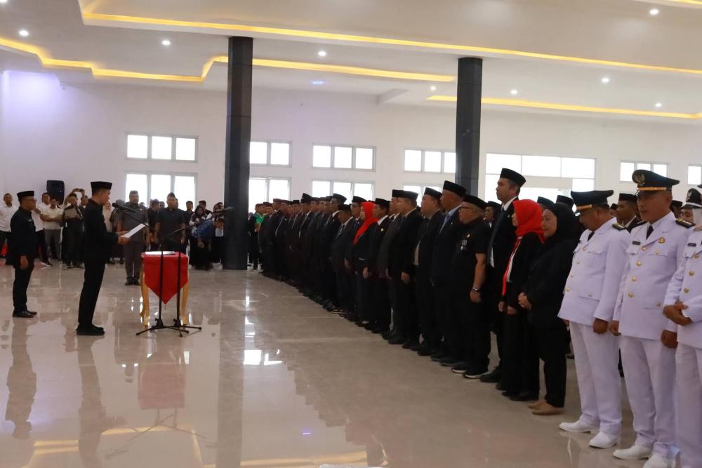 Ratusan pejabat yang dilantik berdiri berbaris mengikuti rangkaian pelantikan dan penegasan komitmen kerja.